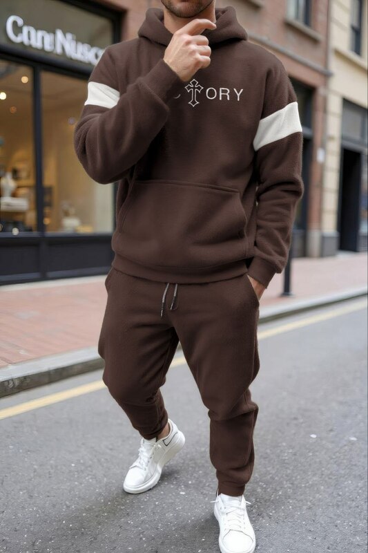 Худі з капюшоном і кишенею-кенгуру,з вишивкою на грудях.Штани з еластичним поясом,бічними кишенями та манжетами на резинці внизу.