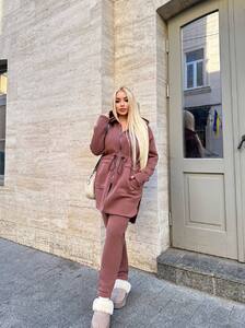 Практичний костюм двійка - ідеальний вибір для зручних та стильних образів.Асиметричний кардиган із капюшоном і куліскою по центру додають оригінальності костюму.