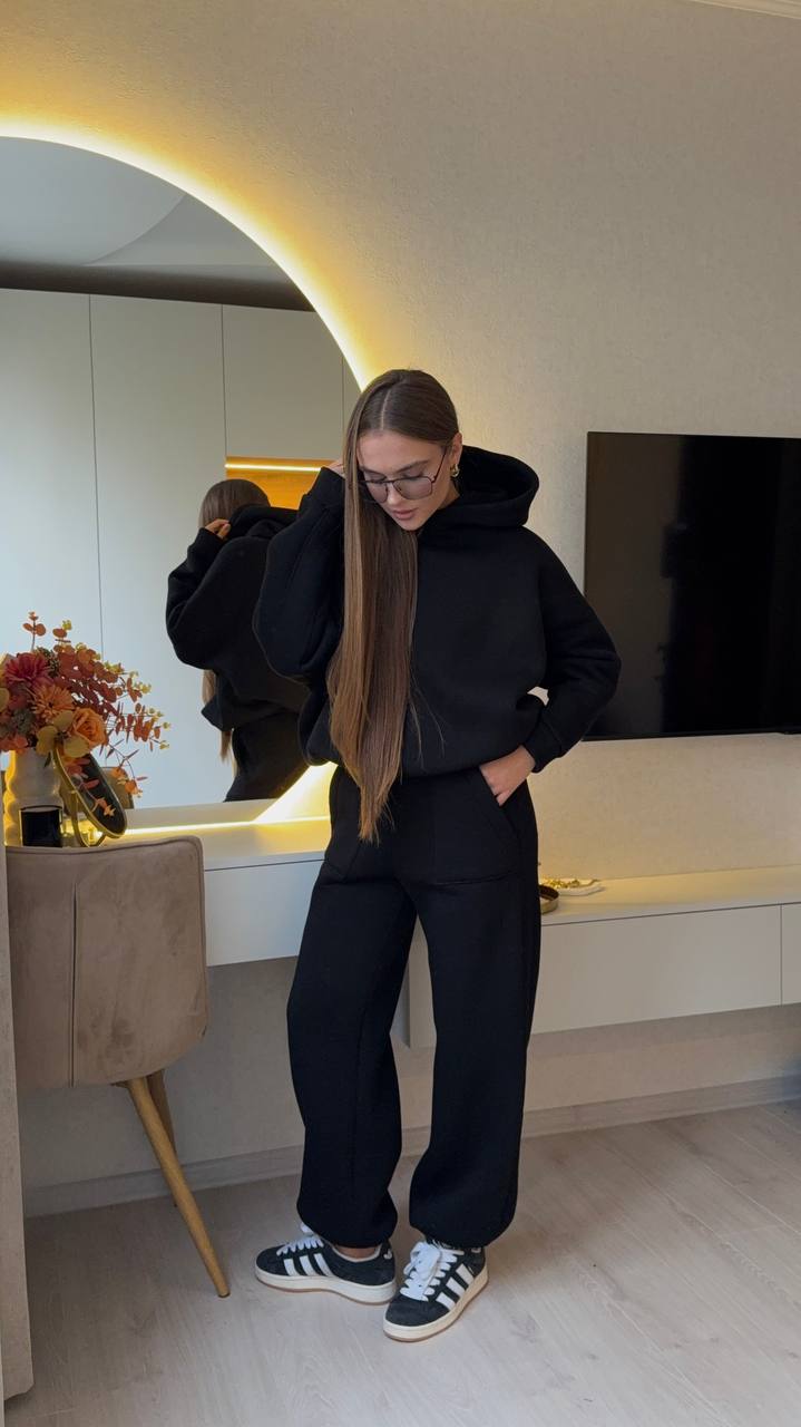 - Об’ємна худі з регульованим низом створює трендовий силует.