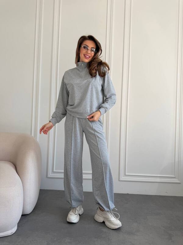 Стильний та комфортний костюм — ідеальний вибір для щоденних образів. Комплект складається зі світшота з високим коміром на блискавці та вільних штанів із м’якою посадкою. Лаконічний дизайн робить модель універсальною — підходить як для прогулянок, так і для подорожей чи домашнього відпочинку.