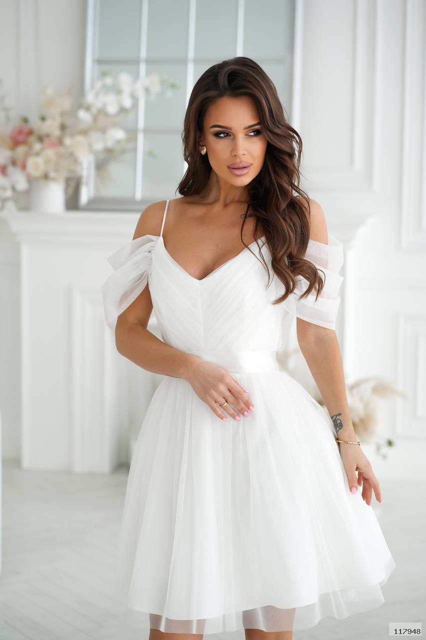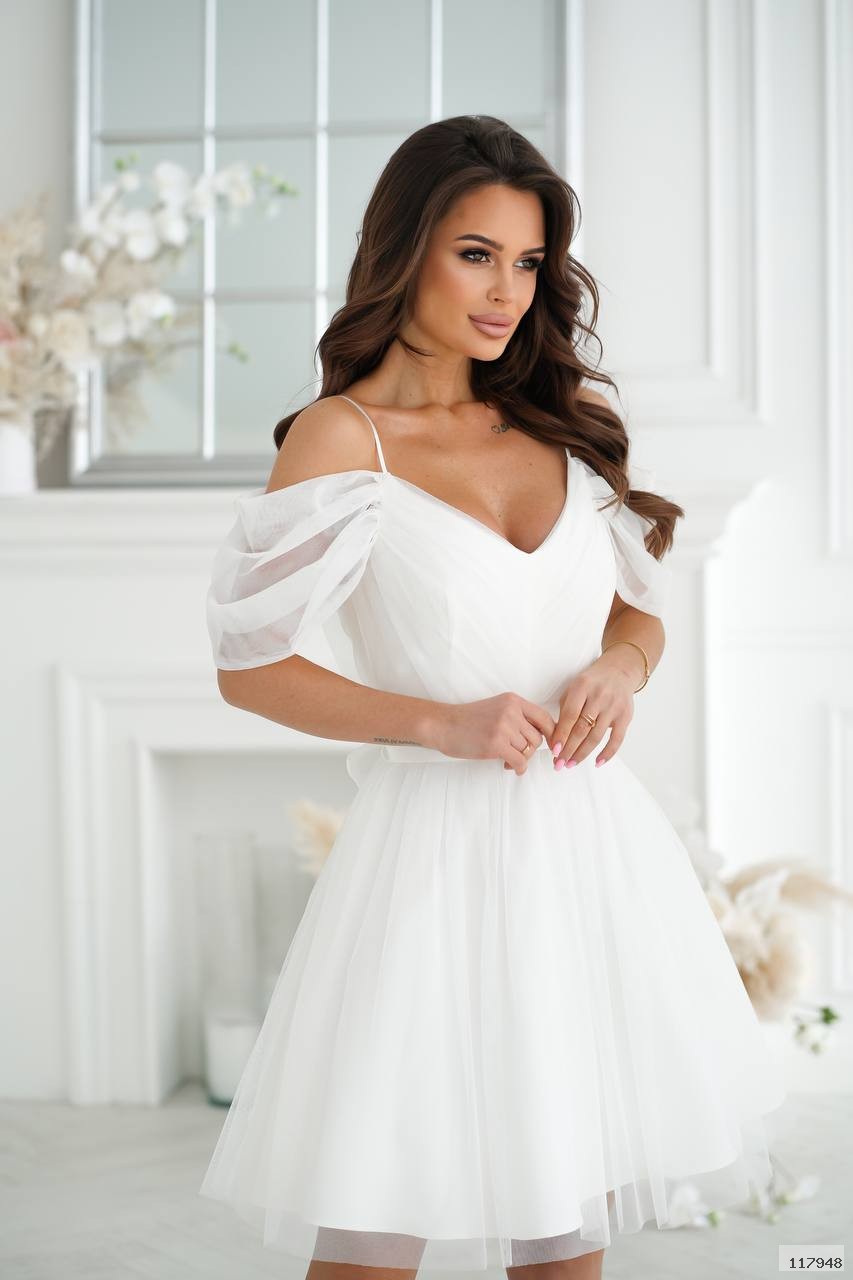 Елегантна коктейльна сукня з пишною спідницею ідеально підійде для вечірнього виходу або особливого випадку. Вона виконана з сітки з багатошаровим оздобленням, що створює повітряний ефект. Верх сукні має драпірування та глибокий V-подібний виріз, що підкреслює лінію декольте та спини. Відкриті плечі прикрашені об’ємними прозорими рукавами, які додають образу романтичності. Талія підкреслена атласним поясом, що зав’язується ззаду. Спідниця має фатиновий під'юбник.