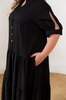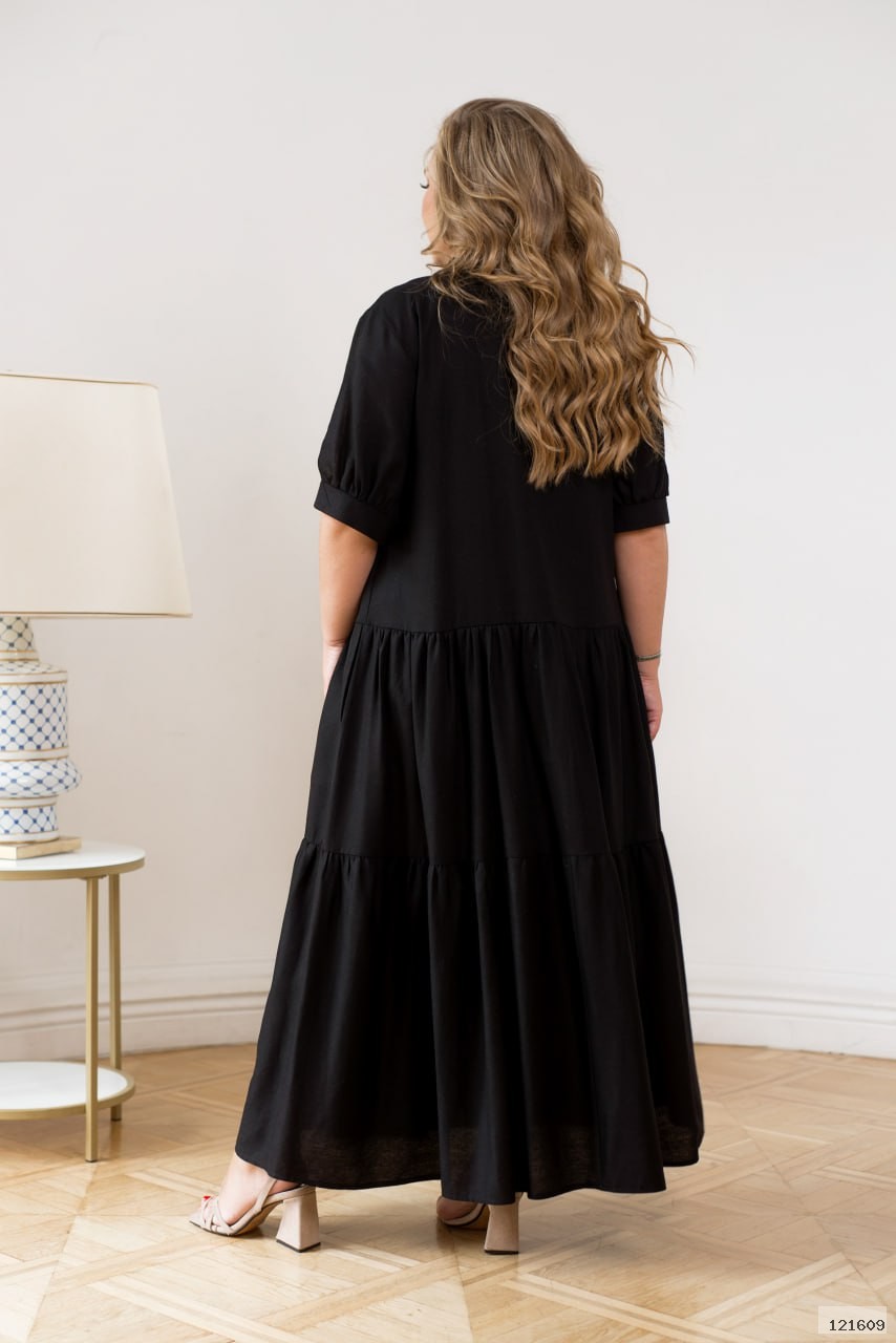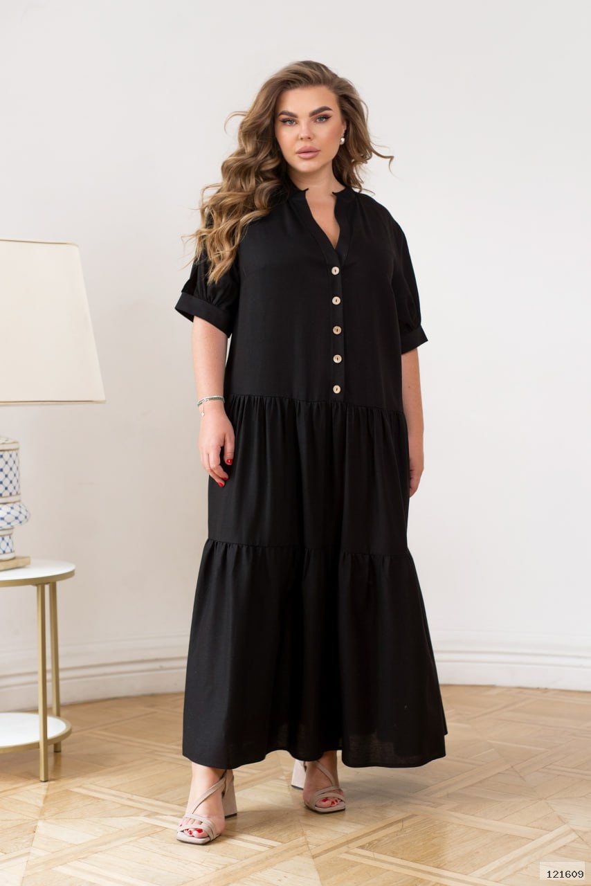 Легка, дихаюча та така стильна — ця лляна сукня стане твоїм улюбленим варіантом на спекотні дні. V-подібний виріз із акуратним комірцем додає образу стриманої жіночності, а ряд ґудзиків спереду — класики з ноткою романтики. Рукави — окрема любов: з розрізами та манжетами, вони виглядають дуже цікаво й дарують свободу рухів. Відрізна спідниця з кількох м’яких воланів створює легкий, живий силует, який красиво колихається на вітрі. Ця сукня — ідеальна для прогулянок, подорожей або просто щоб відчути себе особливою навіть у звичайний день.
