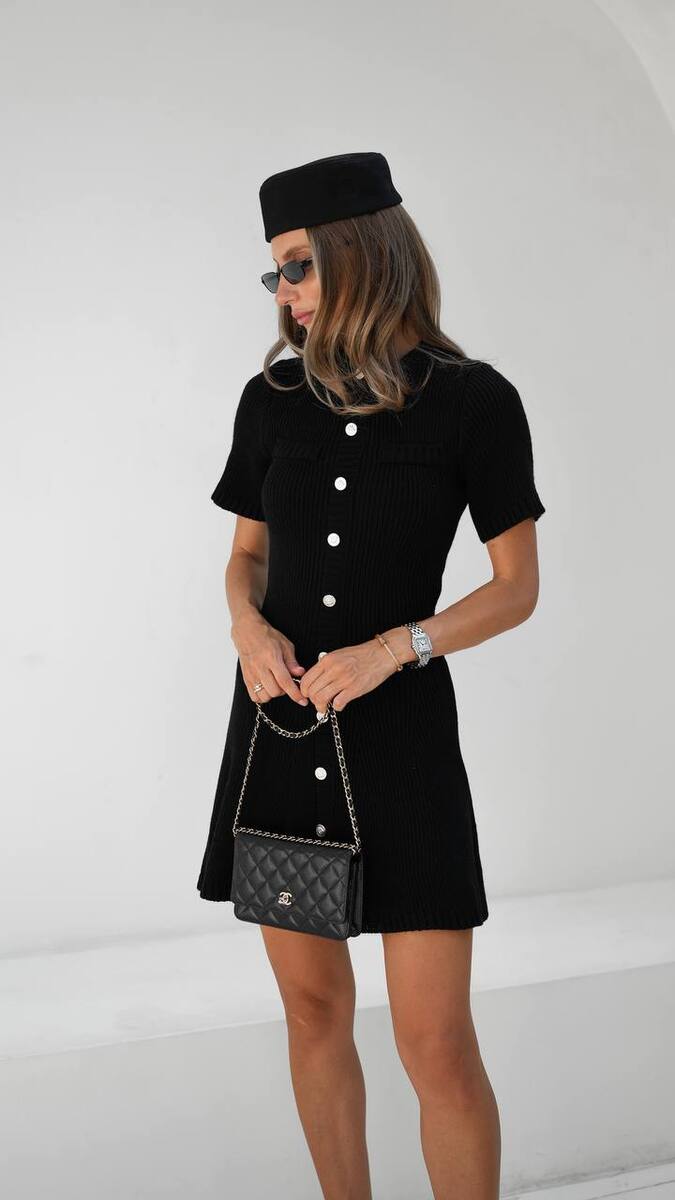 Коротка в'язана сукня з акцентною планкою на ґудзиках — це сучасне переосмислення класики. Приталений силует підкреслює фігуру, вертикальна в'язка візуально витягує лінії, а акуратні кишеньки створюють легкий натяк на ретро-шик.