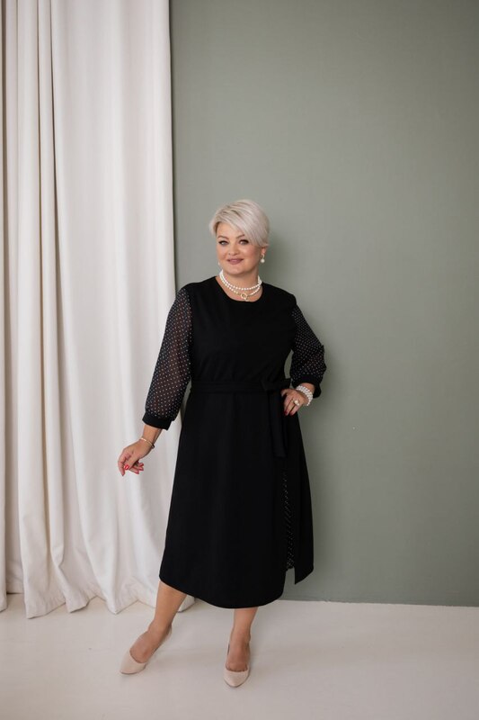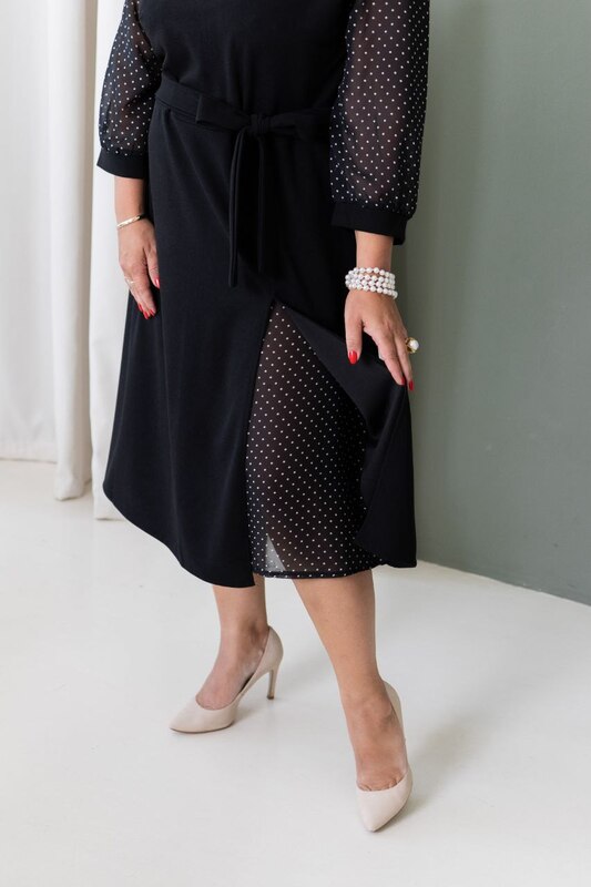 Стильна сукня, основа трикотаж креп дайвінг, вставка та рукавчики виготовлені з шифону з ніжним принтом горошки. Тканина тягнеться, рукав 3/4. Сукня підійде як на кожен день, так і на святковий вихід, чудове поєднання комфортності та елегантності.