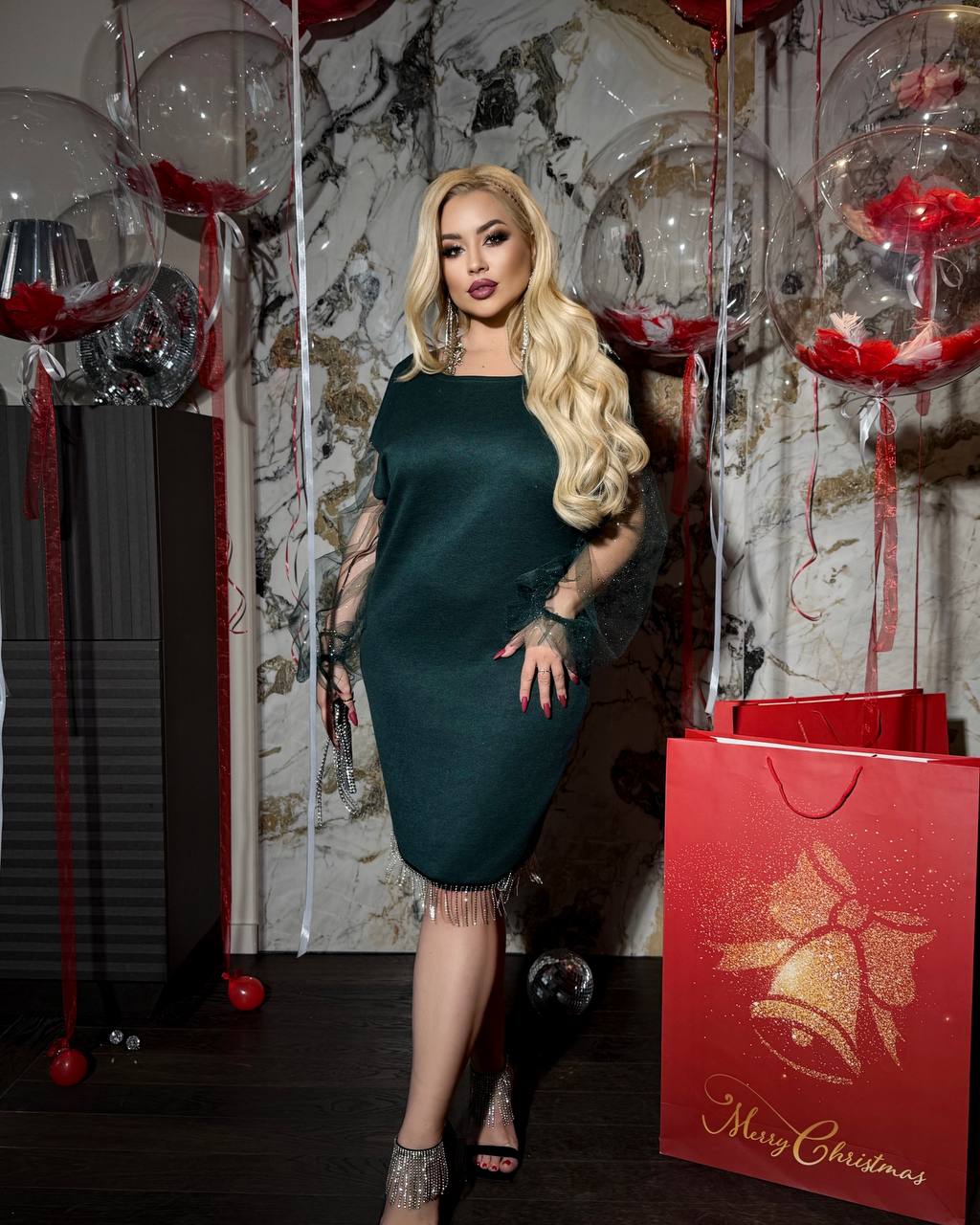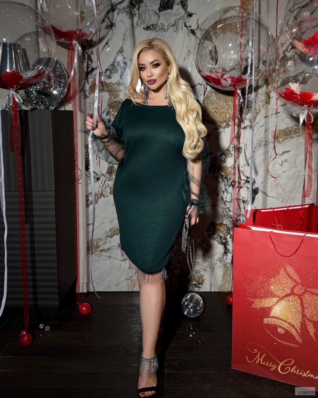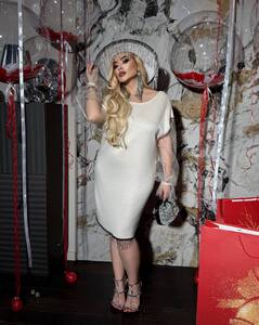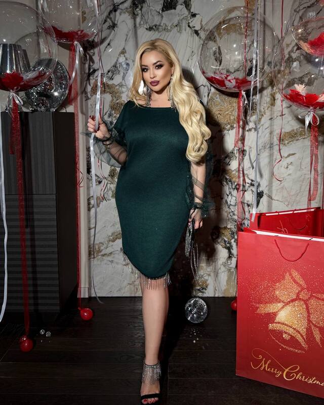 | Ткань: | Ангора двухстороння ( плотна і якісна) Декор: по спинці і низу сукні висячі дрібна тесьма-Бахрома металева! Рукав сітка флок з напиленням блискучим! |