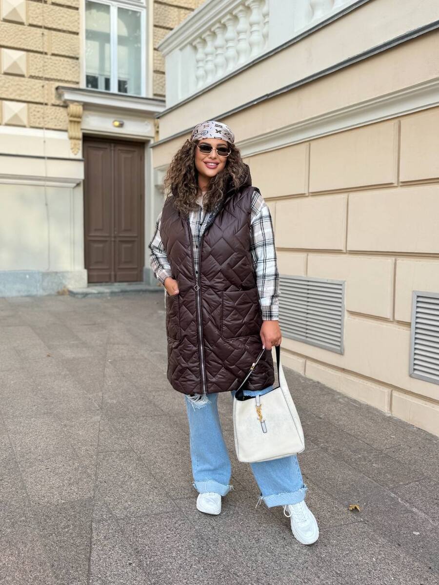 Жилет на подвійній блискавці , із капюшоном та накладними кишенями. Високоякісна стьобана плащівка.