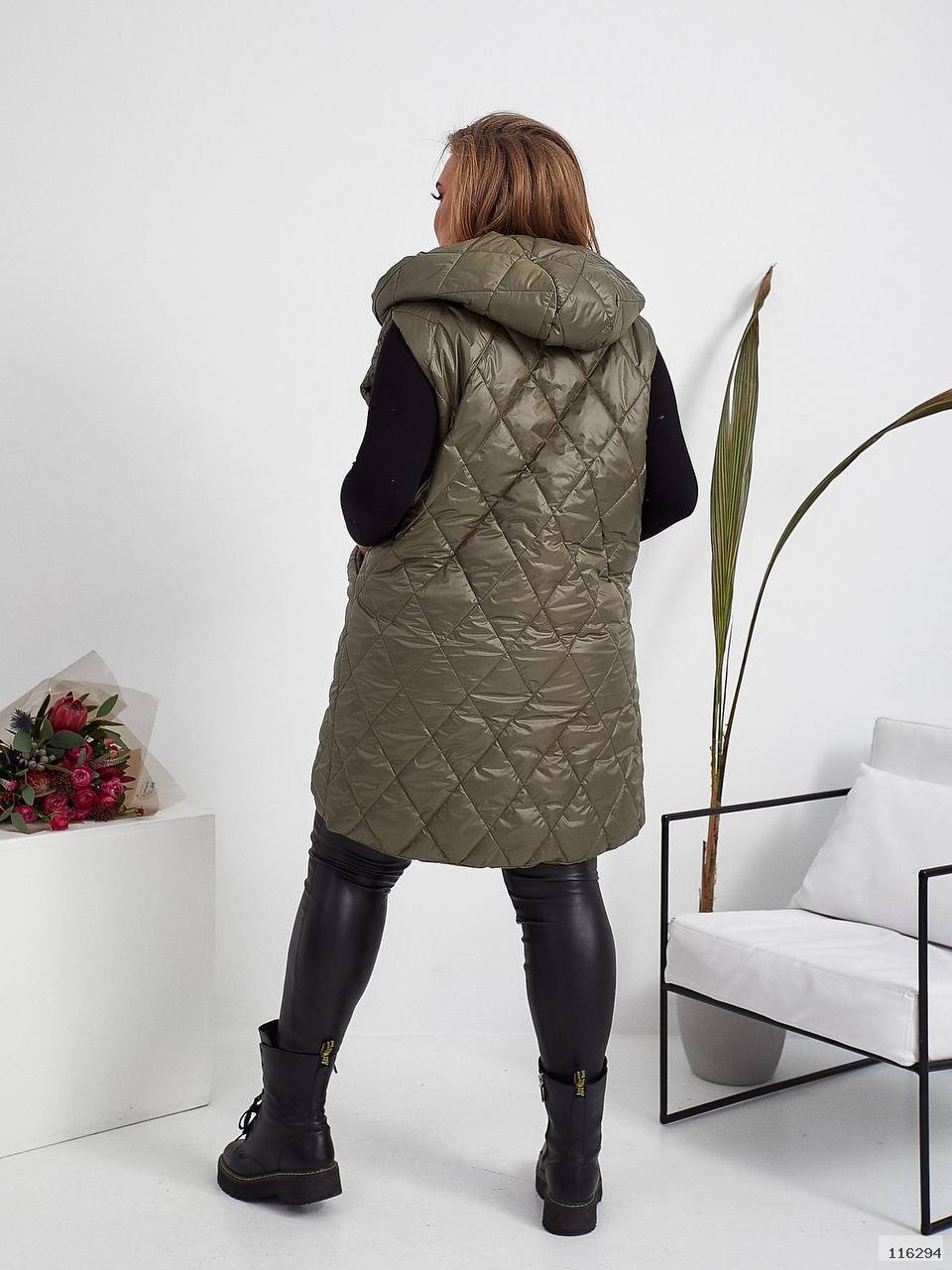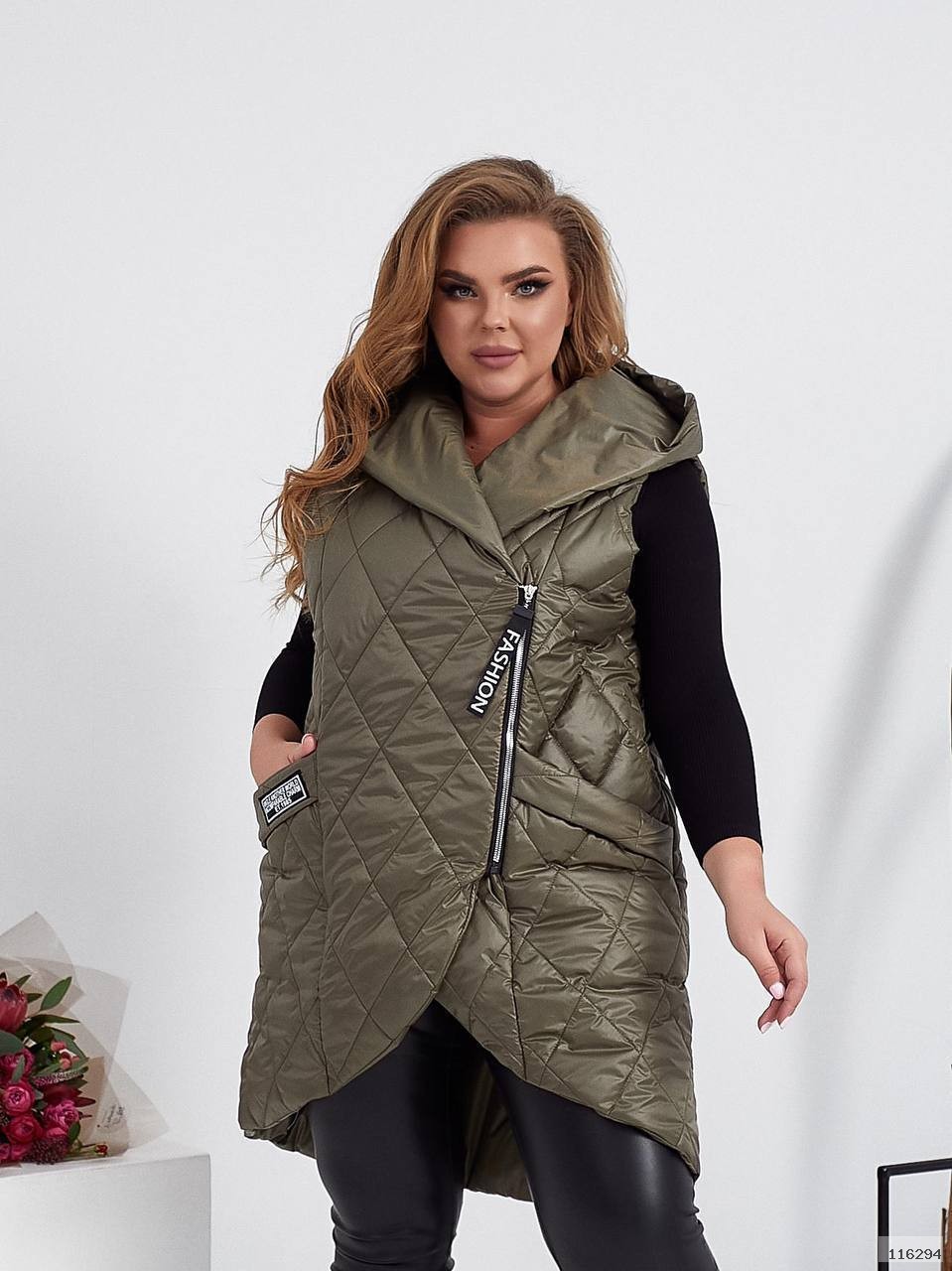 Стильна стегана жилетка прямого крою з кишенями, зручний глибокий капюшон, якісна фурнітура, нашивка