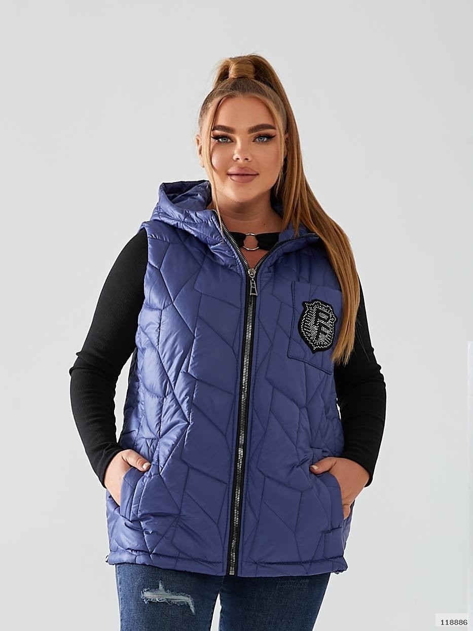 Стильний стьобаний жилет з кишенями, зручний глибокий капюшон, декорована нашивкою з камінням, якісна фурнітура.