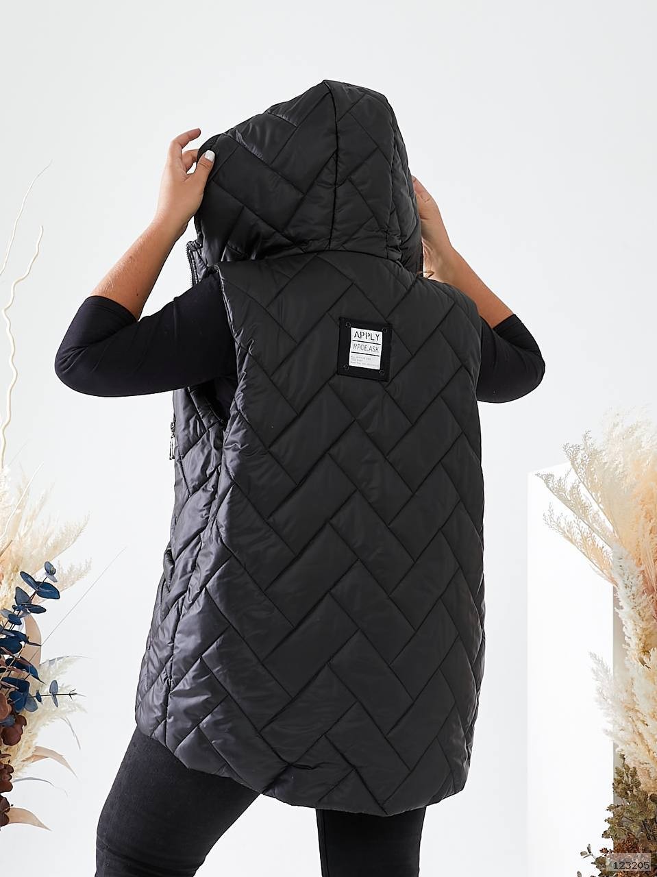 Стильна стьогана жилетка з кишенями, зручний глибокий капюшон, якісна фурнітура.